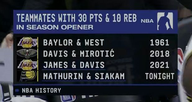 据统计,这是NBA历史上第4队揭幕战同砍30分+10板的队友,前三对分别是21年的詹姆斯和浓眉(湖人),18年的浓眉和米罗蒂奇(鹈鹕),1961年的贝勒和韦斯特。